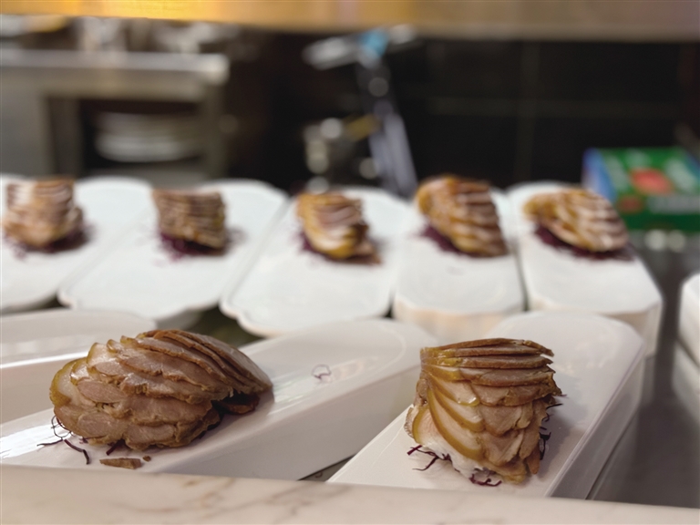 全聚德拉薩店選址于仙足島濱河路二期,店鋪設(shè)計匠心獨運,將古樸典雅的外部風(fēng)貌與簡約優(yōu)雅的現(xiàn)代內(nèi)部裝飾巧妙融合。墻壁上隨處可見的掛畫在介紹著店鋪歷史的同時,更為空間增添了一抹藝術(shù)氣息。開業(yè)當(dāng)天,隨著歡快的開場舞響起,慶典活動正式拉開帷幕。現(xiàn)場,片鴨師傅們以精湛的技藝展示著全聚德的獨特魅力,一只只色澤誘人的烤鴨在他們的巧手下化身為薄如蟬翼的鴨肉片,搭配新鮮的蔥絲、黃瓜條及特制甜面醬卷入薄餅中,一口咬下,鮮美與香甜在口中瞬間綻放,令人回味無窮。