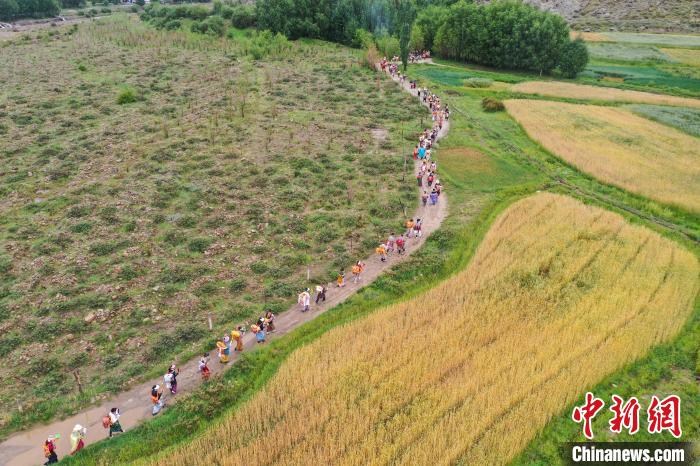 7月24日,西藏拉薩市曲水縣南木村迎來了一年一度的“望果節(jié)”。當(dāng)日,村民們盛裝打扮背上經(jīng)文,圍繞全村田園轉(zhuǎn)上一圈,轉(zhuǎn)到每一塊農(nóng)田前都要煨桑祈求風(fēng)調(diào)雨順、五谷豐登。“望果節(jié)”民俗已有1500多年的歷史,是國家級非物質(zhì)文化遺產(chǎn)。圖為曲水縣南木村村民身著盛裝背上經(jīng)文繞田。(無人機(jī)照片)中新社記者 貢嘎來松 攝