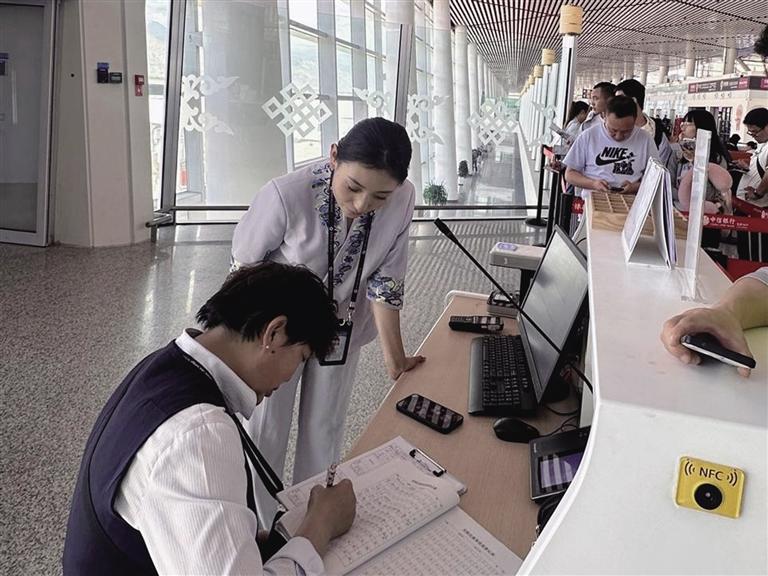 日常工作中,達(dá)娃曲珍也會發(fā)揮自己的語言優(yōu)勢,為藏族旅客提供幫助?!坝行┘亦l(xiāng)人確實(shí)不太會講普通話,用方言進(jìn)行交流會讓他們覺得很親切,溝通過程也會順暢很多。”達(dá)娃曲珍還主動學(xué)習(xí)英語,掃清與外國游客的溝通障礙。常用服務(wù)用語的熟練掌握,為她更好地服務(wù)旅客打下了堅(jiān)實(shí)基礎(chǔ)。