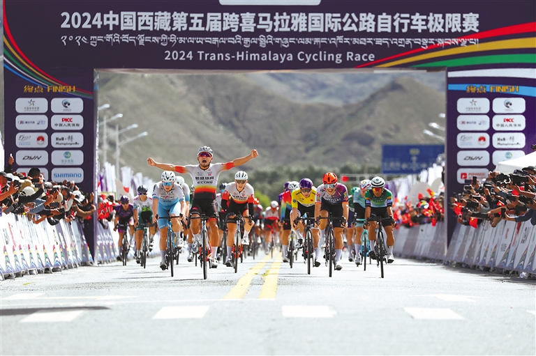 圖為運(yùn)動員沖過日喀則賽段終點(diǎn)線。記者 扎西頓珠 楊子彥 攝