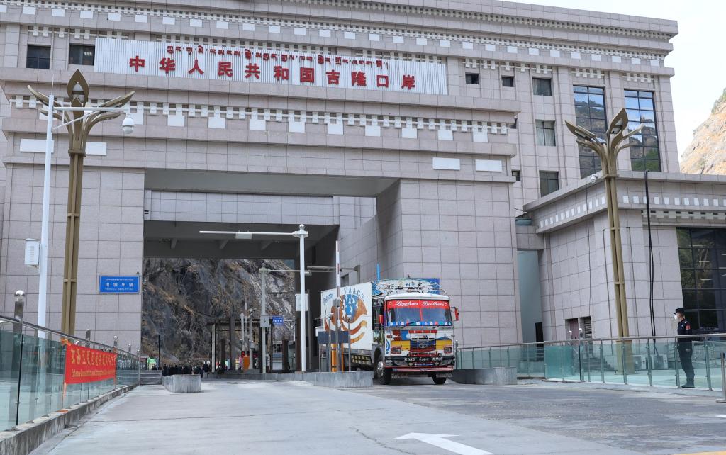 載滿貨物的貨車在吉隆口岸通行。(受訪者供圖)