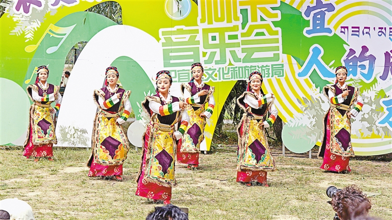 圖為在尼洋河畔濱江公園舉行的林卡主題音樂(lè)會(huì)演出現(xiàn)場(chǎng)。