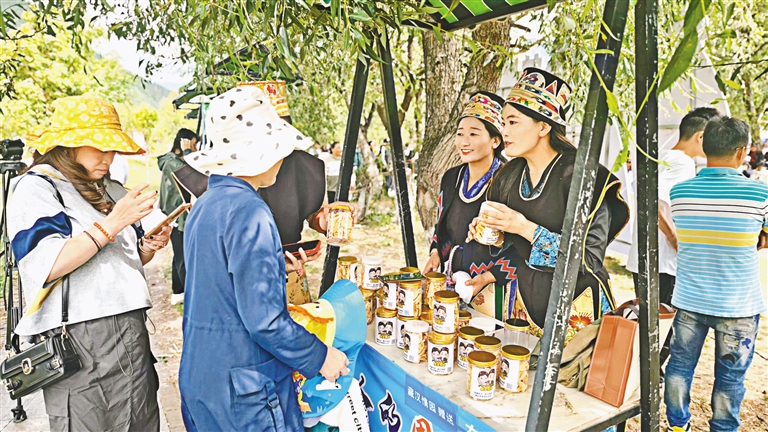 圖為林卡主題音樂(lè)會(huì)上,工作人員為市民、游客介紹農(nóng)特產(chǎn)品。