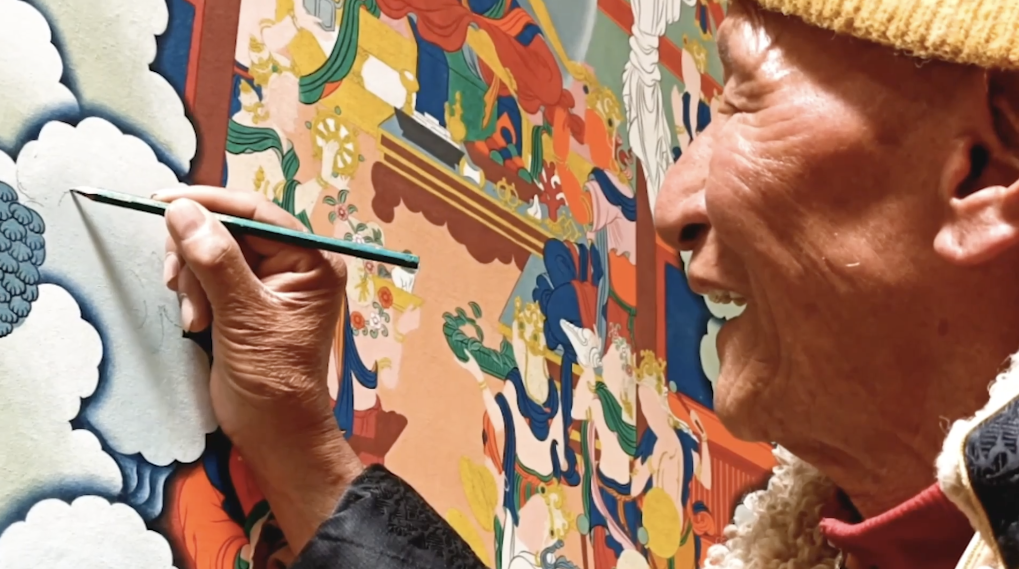 今年92歲高齡的嘎瑪?shù)吕绽先?,是唐卡嘎瑪嘎赤畫派第十代傳承人,曾被西藏自治區(qū)授予“唐卡藝術(shù)大師”等稱號(hào)。