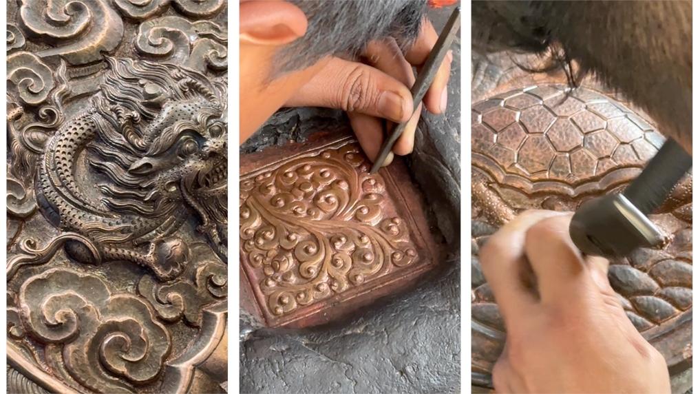 所謂錘揲法,是以銅片或金銀板片為原料,使用鐵臂、鐵套、榔頭、鏨子等工具,敲打出浮雕紋樣、各類造像、建筑裝飾等,對工匠造型能力與經(jīng)驗(yàn)要求很高。