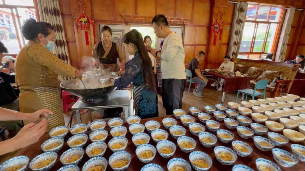 “目前店里紀(jì)錄保持在147碗?!痹诩{西民族鄉(xiāng)經(jīng)營果拉叢農(nóng)家樂的果拉卓瑪說,“但生活再好也不能浪費(fèi)。我們會提醒客人,如果吃飽了,只需用筷子在碗上搭出尖尖,就會停止加面;但對于不搭筷子的客人,我們還會再勸一碗?!?/p>
