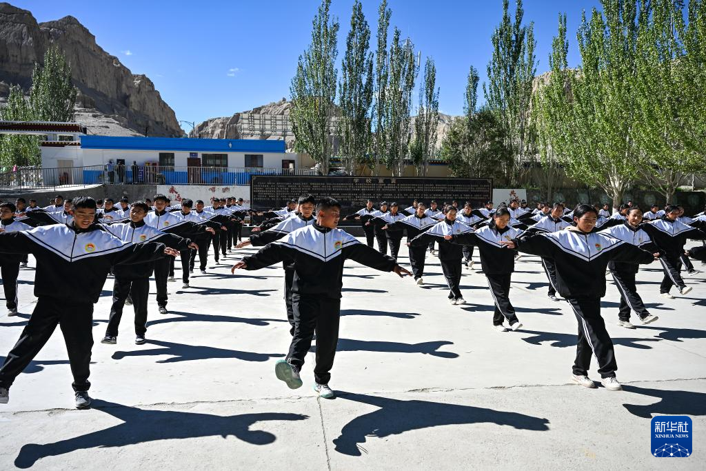 在西藏阿里地區(qū)札達縣九年一貫制學校,學生們跳起融入“宣舞”特色的課間操(9月10日攝)。新華社記者 孫瑞博 攝