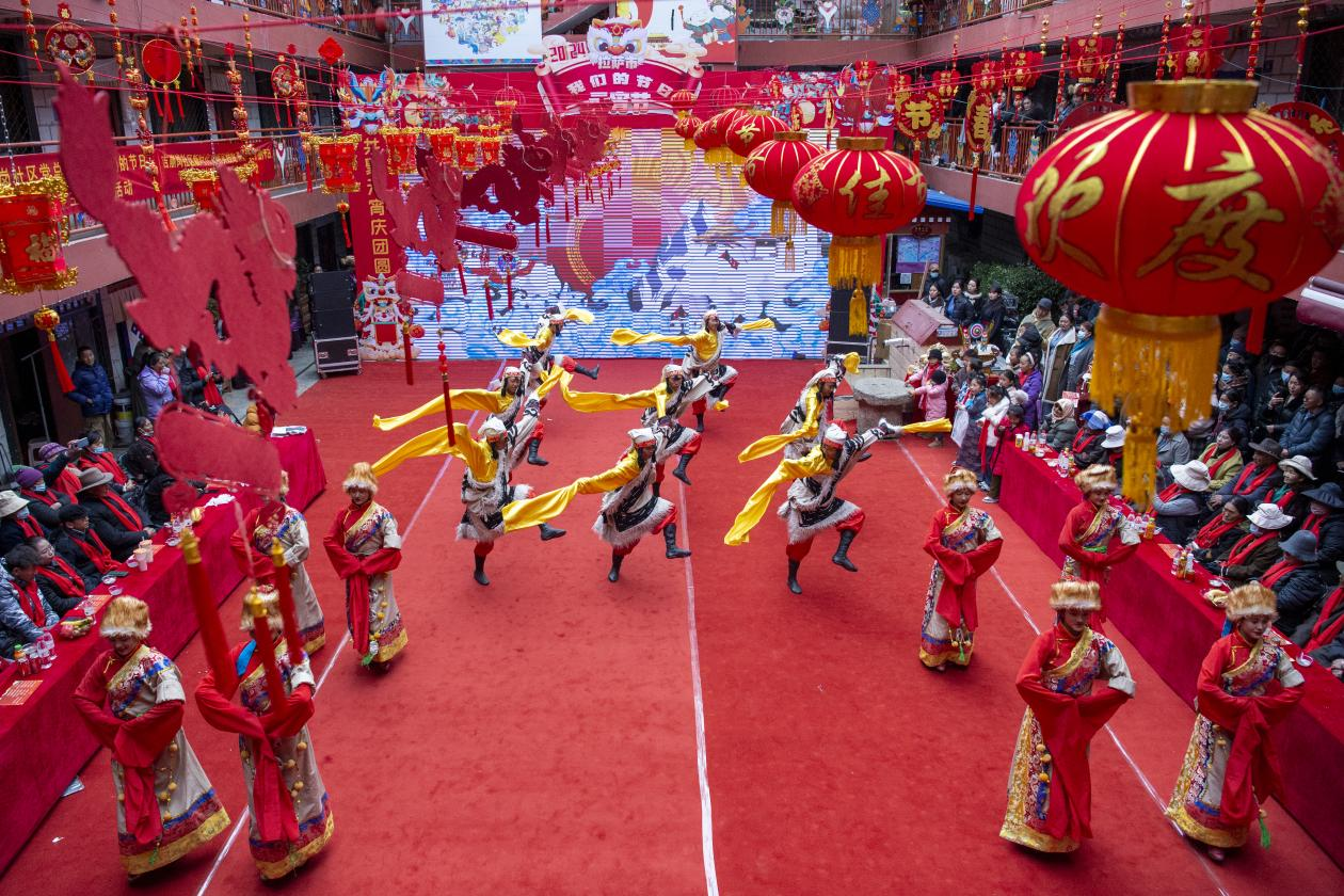 圖為元宵節(jié)期間拉薩市城關(guān)區(qū)雪巴拉姆藝術(shù)團的演員在拉薩德賽大院里表演。新華網(wǎng) 旦增努布 攝