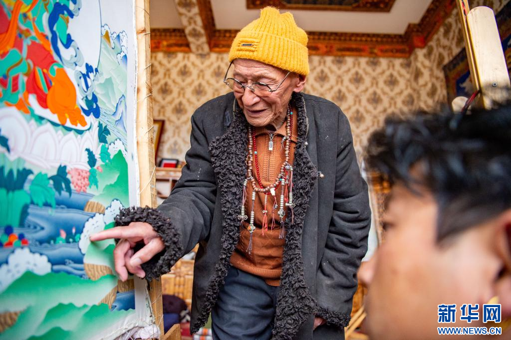 10月17日,今年92歲的昌都嘎瑪嘎赤畫派國(guó)家級(jí)非遺傳承人嘎瑪?shù)吕赵诩耶嬏瓶?。新華網(wǎng) 旦增努布 攝