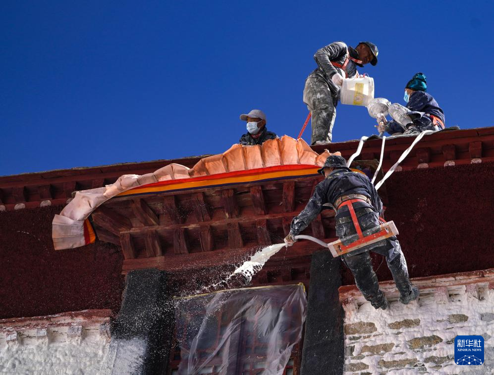 10月30日,布達(dá)拉宮管理處的工作人員在噴灑涂料。新華社記者 旦增尼瑪曲珠 攝