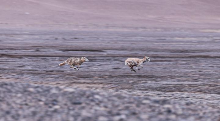 生命的新生與逝去,正如風(fēng)雪與陽光、黑暗與朝霞一樣,千百萬年間在羌塘這片廣袤的大地上循環(huán)往復(fù)。藏羚羊與野狼都各自為著自己種族的延續(xù)而努力著。我可以確定,當(dāng)我們離開羌塘,這只母羊會立刻成為掠食動物們繁衍生息的營養(yǎng)。這是藏羚羊的悲歌,卻是掠食動物的歡歌!這是生命的悲歌,也是歡歌!是大自然邊走邊唱的行歌!雖然無聲,卻震耳欲聾。