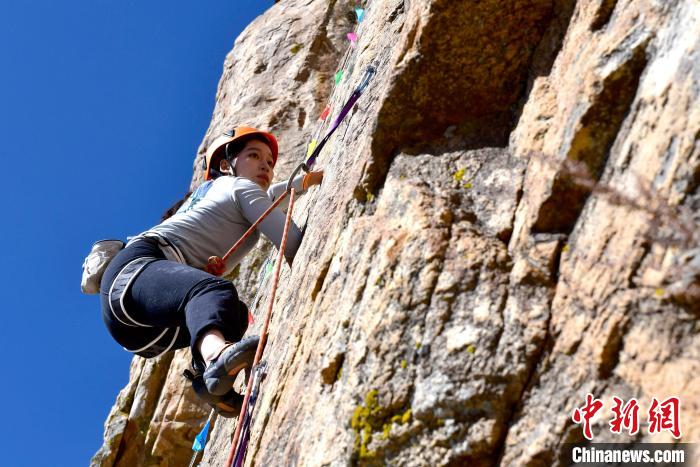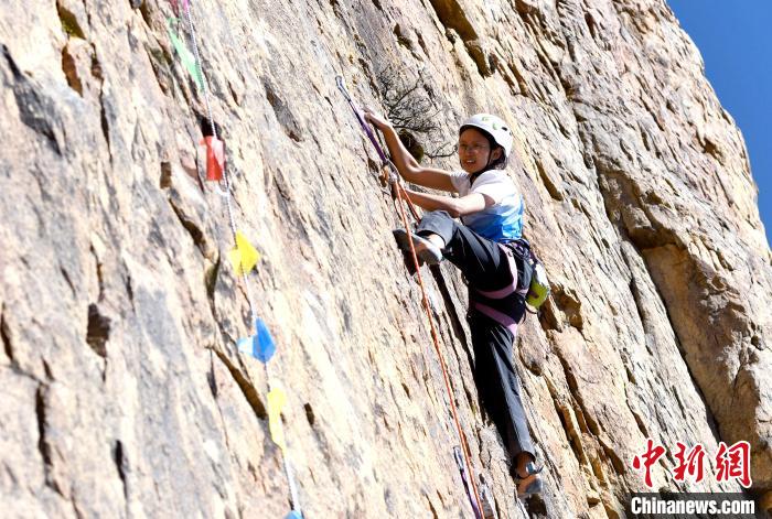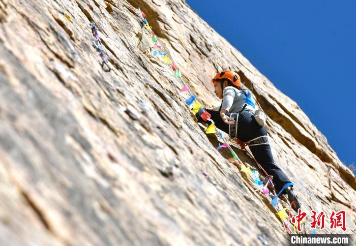 11月17日,2024年西藏自治區(qū)攀巖自然巖壁公開賽決賽在拉薩市城關(guān)區(qū)奪底街道吉倉自然巖壁場地舉行。本次賽事共有來自全國的55名選手參賽,分預(yù)賽和決賽兩輪。圖為參賽選手劉亞豪決賽中。中新社記者 李林 攝