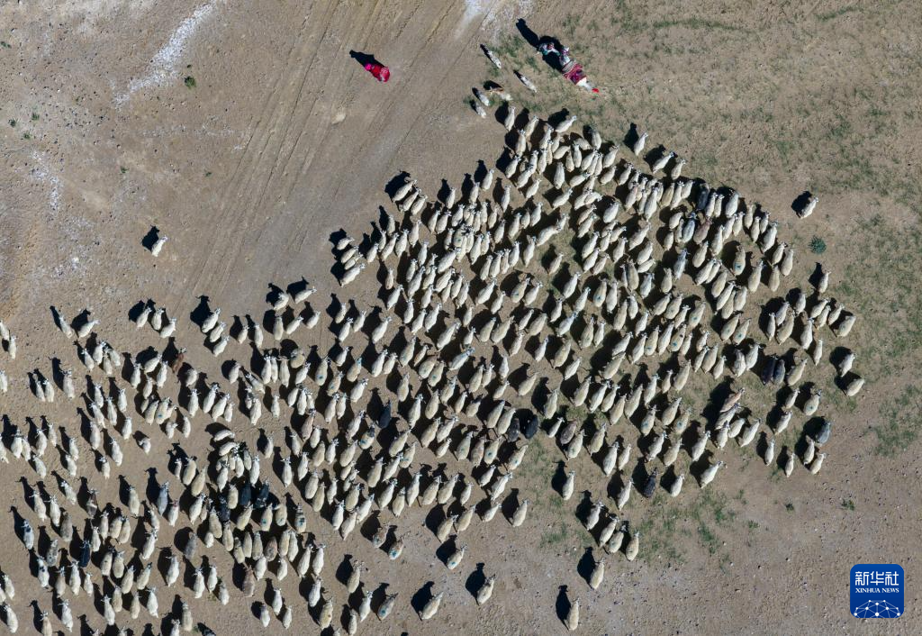 日土縣牧民在放牧白絨山羊(無人機(jī)照片,2023年9月21日攝)。新華社記者 姜帆 攝