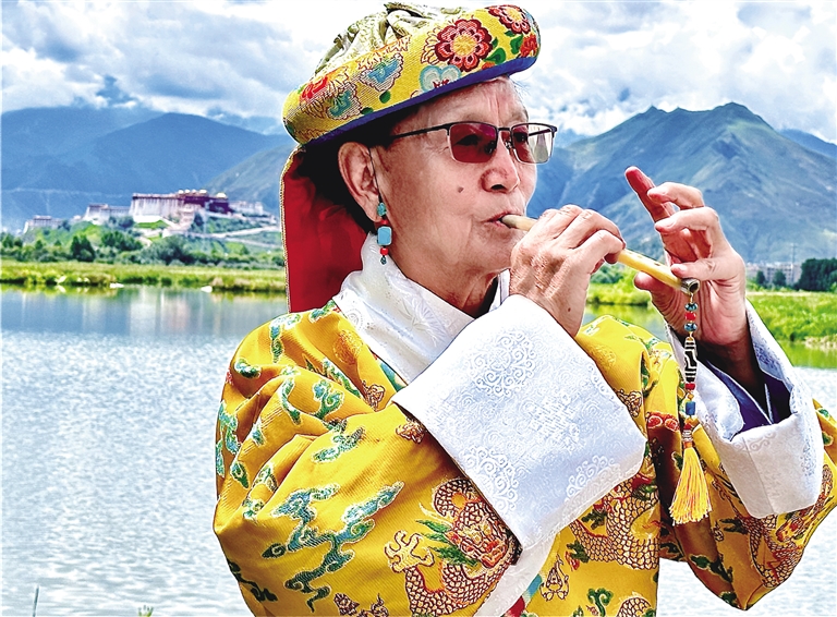 鷹笛是來自于大自然的樂器,吹奏出的每個(gè)音符蘊(yùn)含了大自然的靈性。笛聲如同在天空中任意翱翔的雄鷹,高亢且空靈,似乎在訴說著千年的傳奇。今年74歲的次旦,是國(guó)家一級(jí)演奏員,也是自治區(qū)級(jí)藏族鷹笛藝術(shù)非物質(zhì)文化遺產(chǎn)代表性傳承人。次旦老師從小和鷹笛結(jié)下了不解之緣,并立志要將藏族鷹笛藝術(shù)發(fā)揚(yáng)光大。如今,退休在家的次旦老師依舊奔忙在傳播藏族鷹笛藝術(shù)的工作中,為傳承“非遺”貢獻(xiàn)著自己的力量。