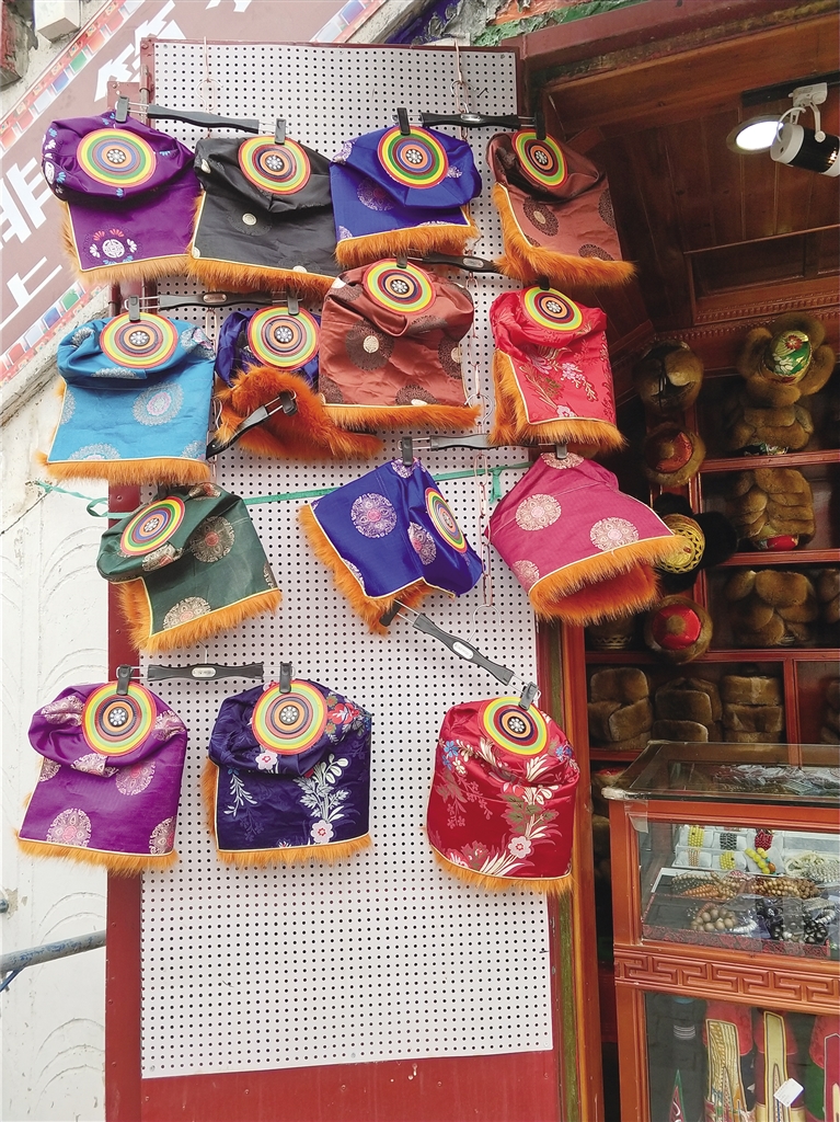 藏式保暖帽的材質多為人造毛,有的則是純羊絨,面料多為絲綢,邊沿鑲以絲帶,圖案也不盡相同。帽子的主體呈圓柱形,在后腦勺部位有個彩色的光圈封頂,能夠很好地蓋住整個頭部及兩耳。絢麗的顏色,即便是在人頭攢動的街頭也很顯眼。