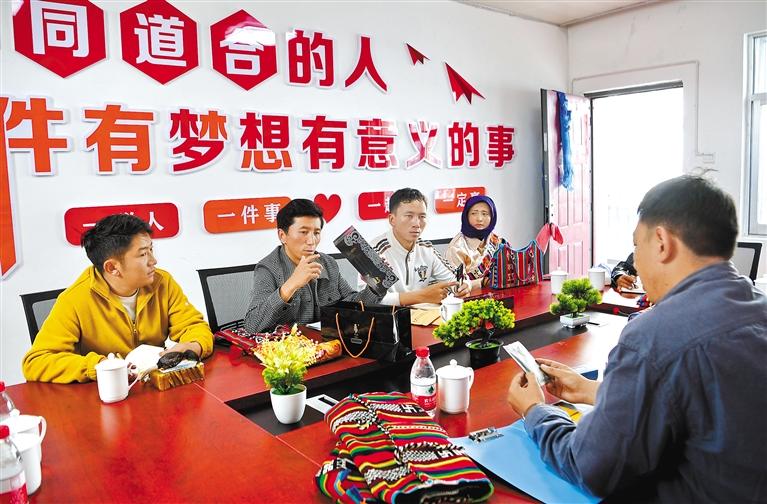 那曲市安多縣的大學(xué)畢業(yè)生倉秋多吉聯(lián)合6人創(chuàng)業(yè),于2021年創(chuàng)辦了安多托尕爾倉游牧產(chǎn)業(yè)有限責(zé)任公司。公司搭建了民族手工藝產(chǎn)品、土特產(chǎn)銷售平臺,在當(dāng)?shù)卣畠?yōu)化營商環(huán)境政策的支持下,創(chuàng)業(yè)團隊逐步擴大,帶動了當(dāng)?shù)剞r(nóng)牧民產(chǎn)業(yè)興旺?!D為倉秋多吉(左二)和團隊核心成員商討產(chǎn)品銷售提升策略。(資料圖片) 新華社記者 張汝鋒 攝