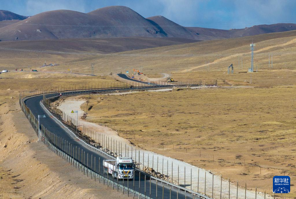 貨車從兩側(cè)遍布熱棒的青藏公路一段經(jīng)過(12月2日攝)。新華社記者 姜帆 攝