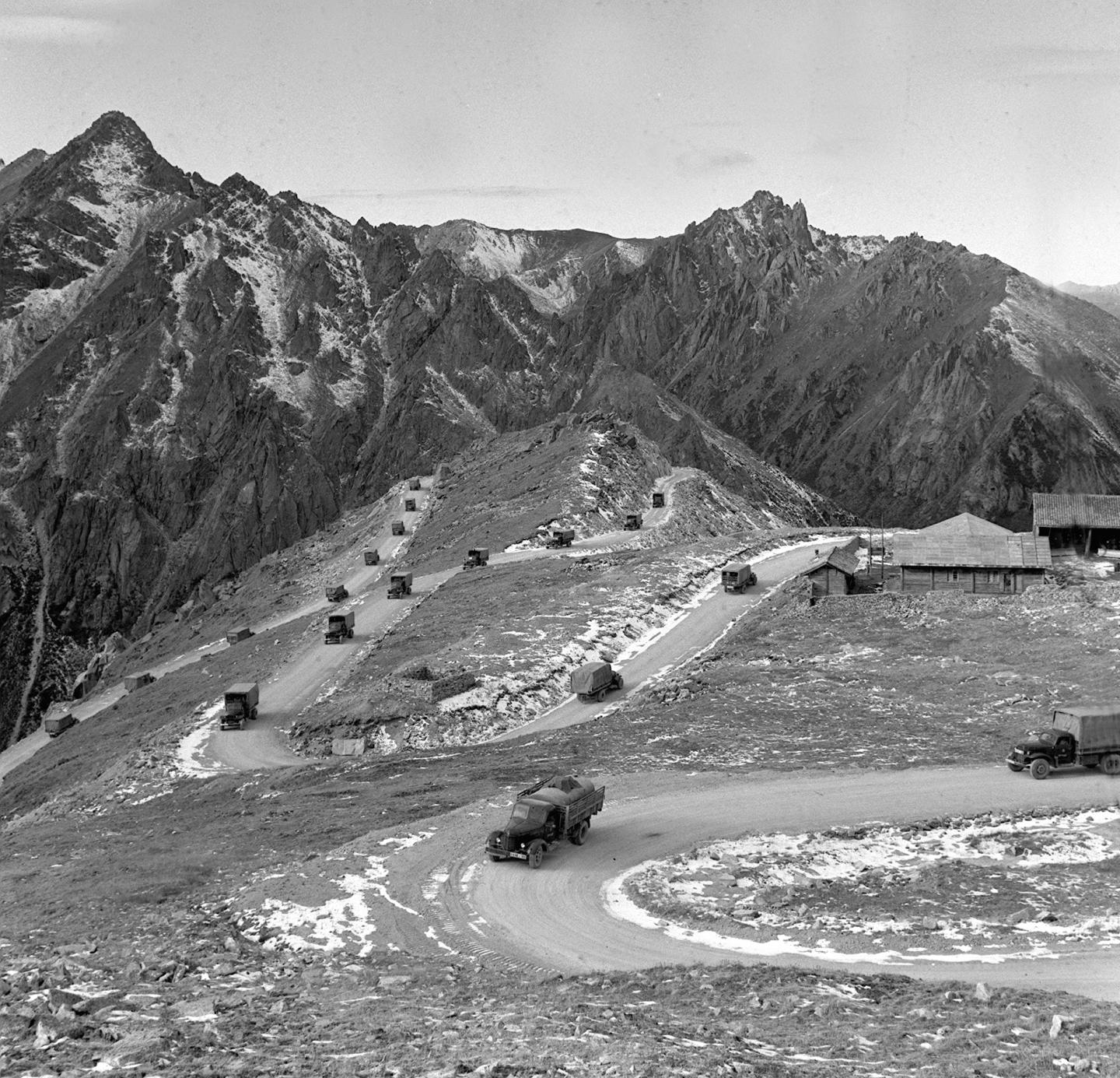 1964年,滿載建設(shè)物資的汽車(chē)隊(duì)行駛在川藏公路途中的雀兒山上。