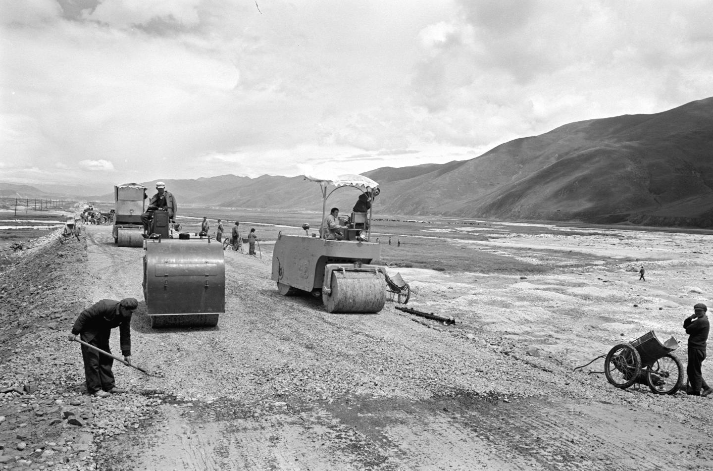 1979年,工人們?cè)诓乇备咴鲜┕?,為青藏公路鋪設(shè)柏油路面。