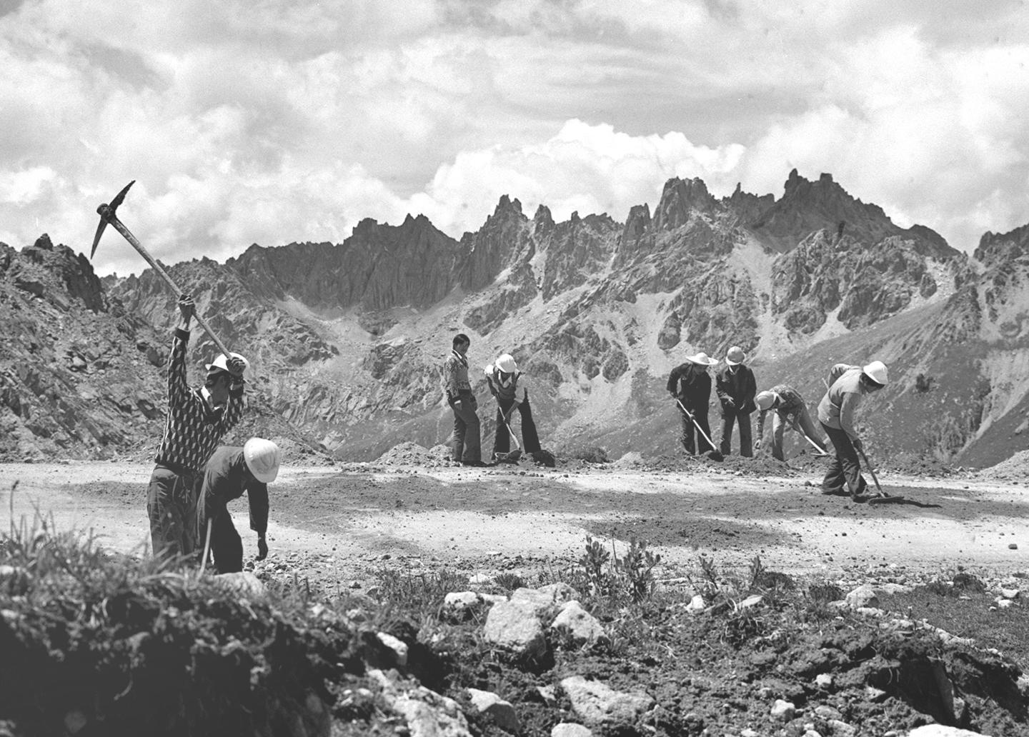 二十世紀(jì)60年代,在川藏公路上,辛勤的藏族養(yǎng)路工人熱情地向過(guò)路的旅客們揮手。