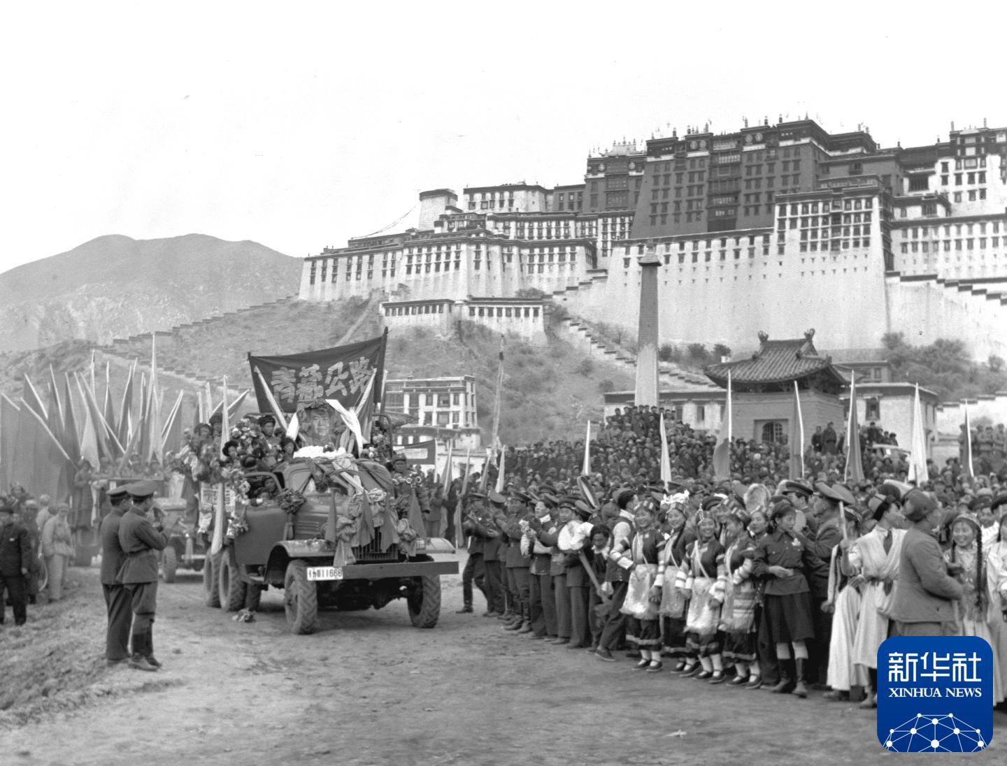 1954年12月25日,川藏公路、青藏公路同時正式通車。這是通車儀式在西藏拉薩舉行。新華社發(fā)