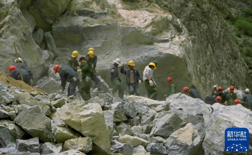 1950年,筑路大軍挺進(jìn)西藏途中,官兵們在冰冷刺骨的河水中抬運(yùn)石料。新華社發(fā)