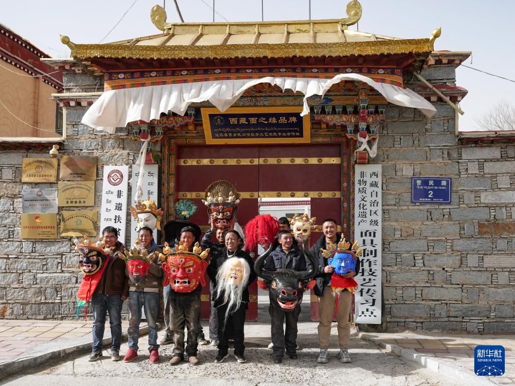 12月9日,拉薩達(dá)孜區(qū)雪鄉(xiāng)民間傳統(tǒng)手工藝農(nóng)民專業(yè)合作社的面具制作工匠們?cè)诤献魃玳T(mén)口合影。新華社記者 晉美多吉 攝