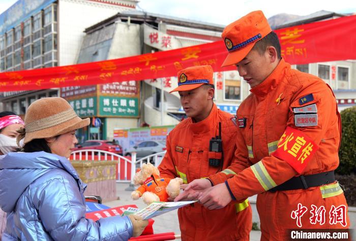 圖為西藏森林消防總隊林芝支隊巴宜區(qū)中隊元旦假期防火專項行動中發(fā)放禮品。西繞拉翁 攝