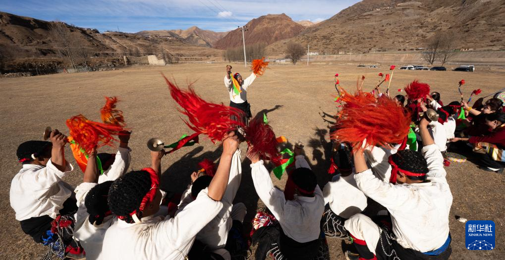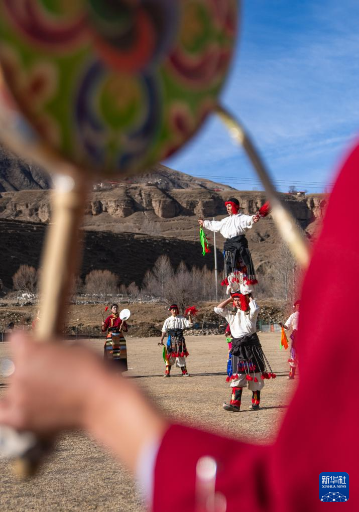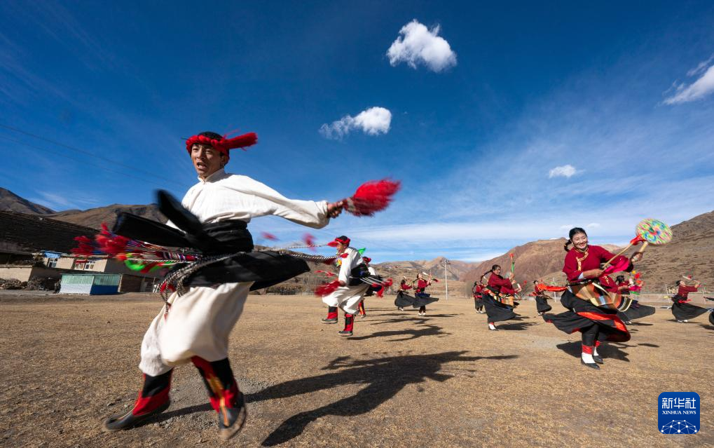西藏昌都市丁青縣尺犢鎮(zhèn)烏巴村文藝演出隊在跳熱巴舞(1月5日攝)。新華社記者 丁增尼達(dá) 攝