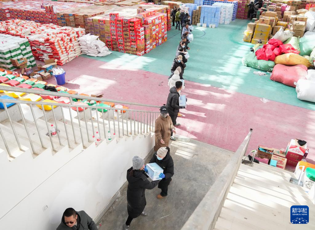 1月8日,在定日縣人民政府的救援物資點(diǎn),干部群眾接力傳遞救援物資。新華社記者 丁汀 攝