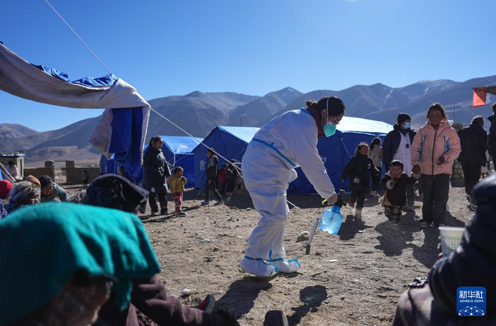 1月8日,在定日縣措果鄉(xiāng)野江村安置點(diǎn),醫(yī)護(hù)人員進(jìn)行消殺。新華社記者 晉美多吉 攝