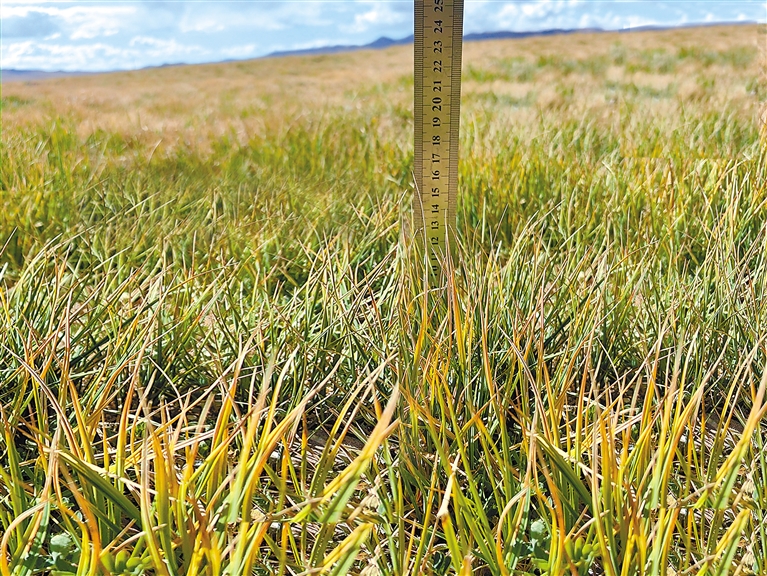 科研人員視察那曲市色尼區(qū)那么切鄉(xiāng)生態(tài)修復點牧草長勢情況。