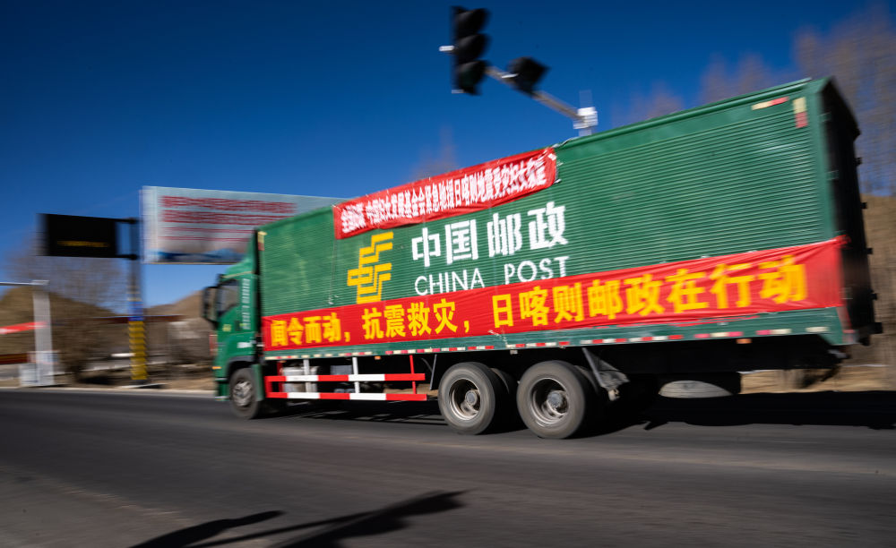 2025年1月8日,在日喀則,中國郵政的抗震救災(zāi)物資運(yùn)輸車輛向震中方向駛?cè)?。新華社記者 丁增尼達(dá) 攝