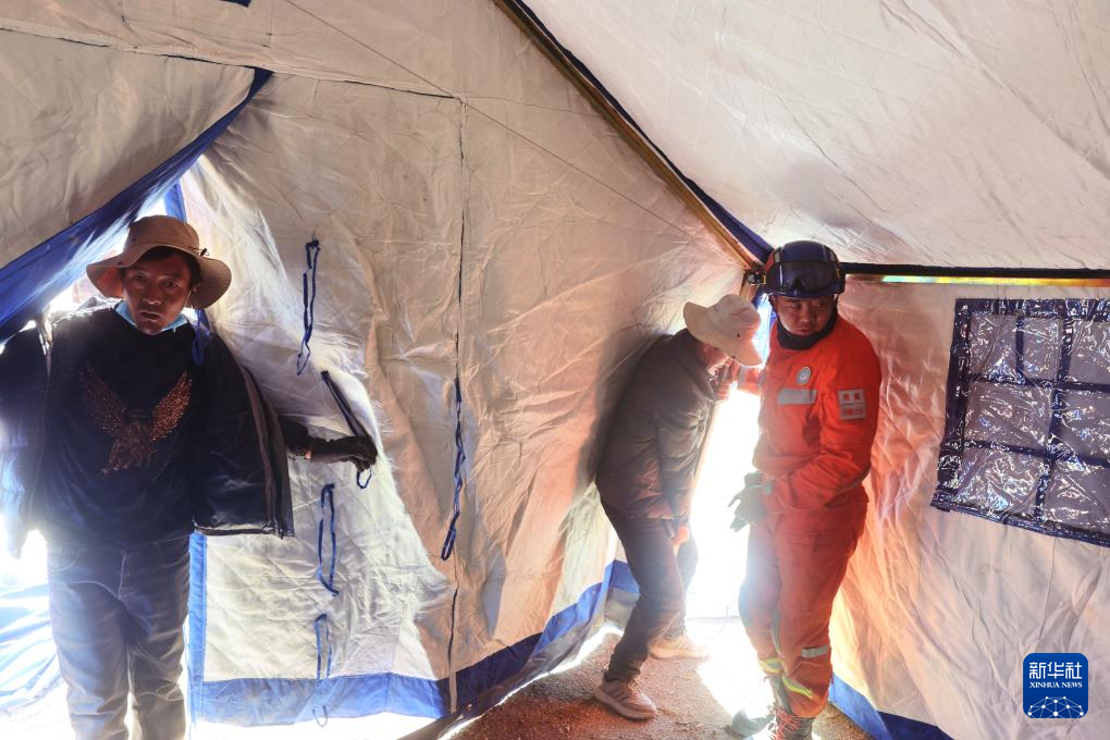 1月9日,救援人員在措布村幫助受災(zāi)群眾搭建帳篷。新華社記者 姜帆 攝