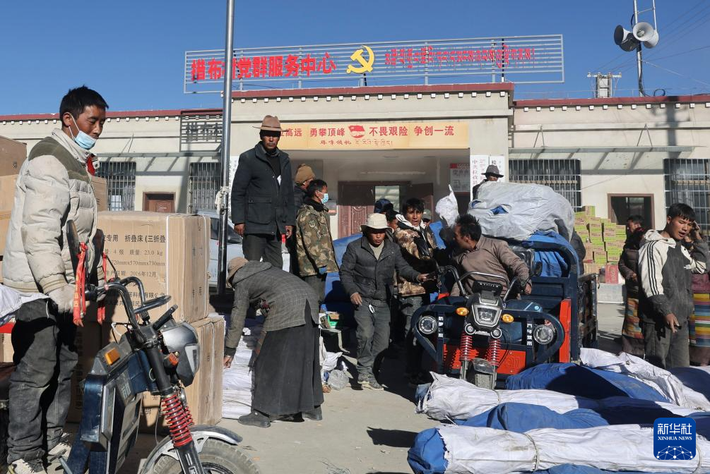 1月9日,受災(zāi)群眾在措布村村委會領(lǐng)取救災(zāi)物資。新華社記者 姜帆 攝