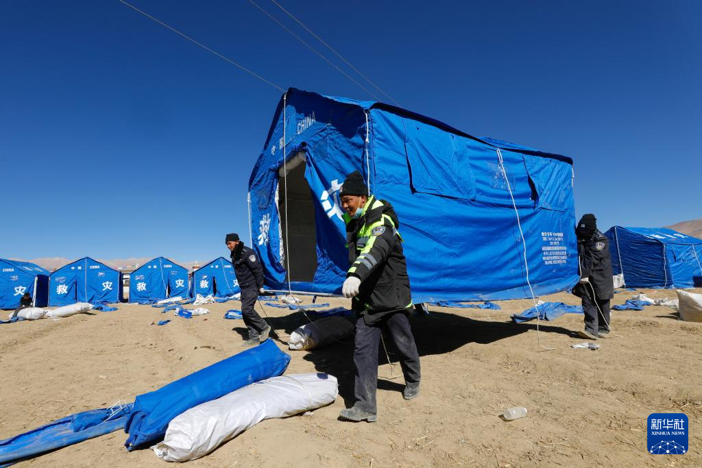 2025年1月8日,在日喀則市定日縣措果鄉(xiāng)雪珠村安置點(diǎn),救援人員幫助受災(zāi)群眾搭建帳篷。新華社記者 沈伯韓 攝