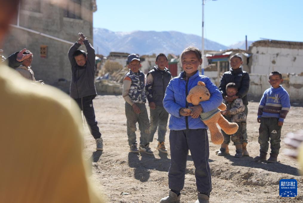 2025年1月8日,在日喀則市定日縣措果鄉(xiāng)塘仁村地震災(zāi)后安置點(diǎn),工作人員向孩子們贈(zèng)送玩偶熊,并給他們表演節(jié)目。新華社記者 晉美多吉 攝