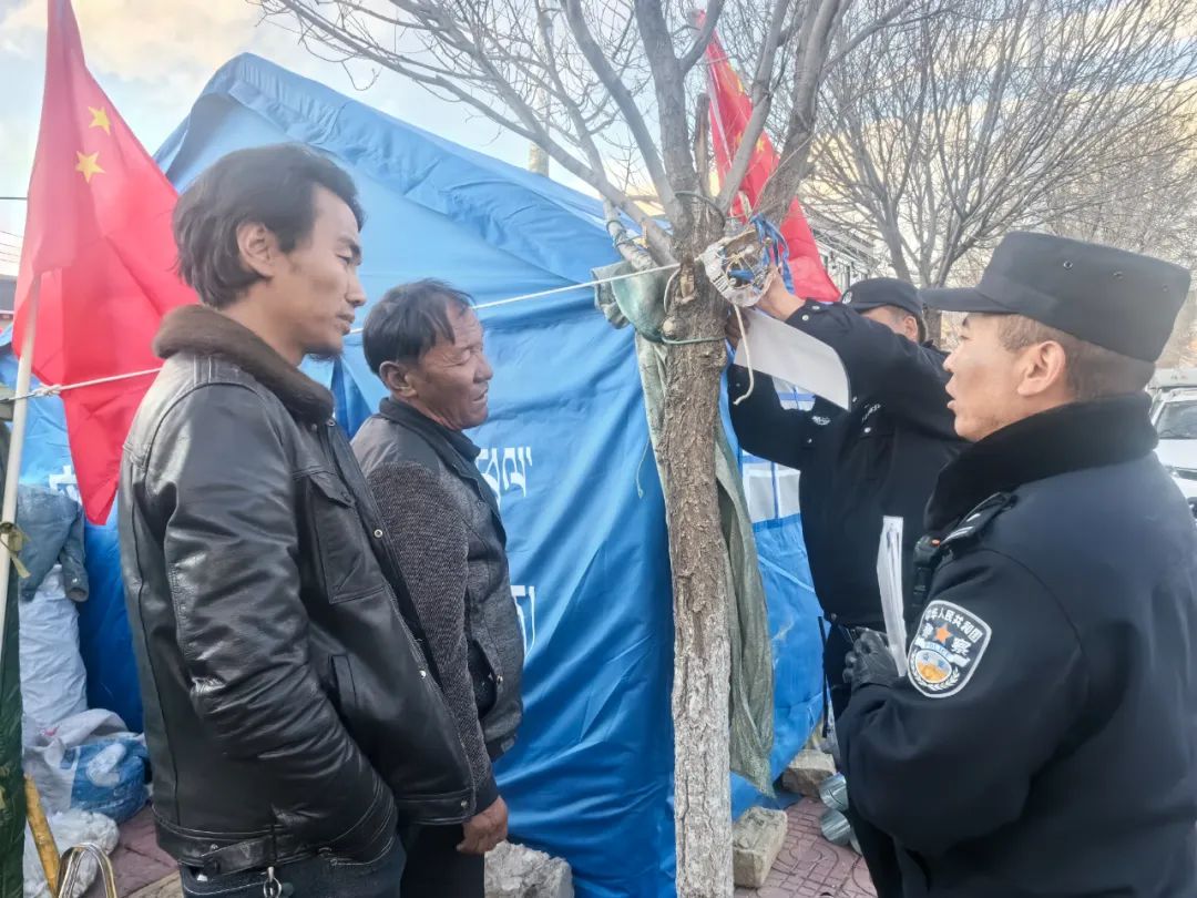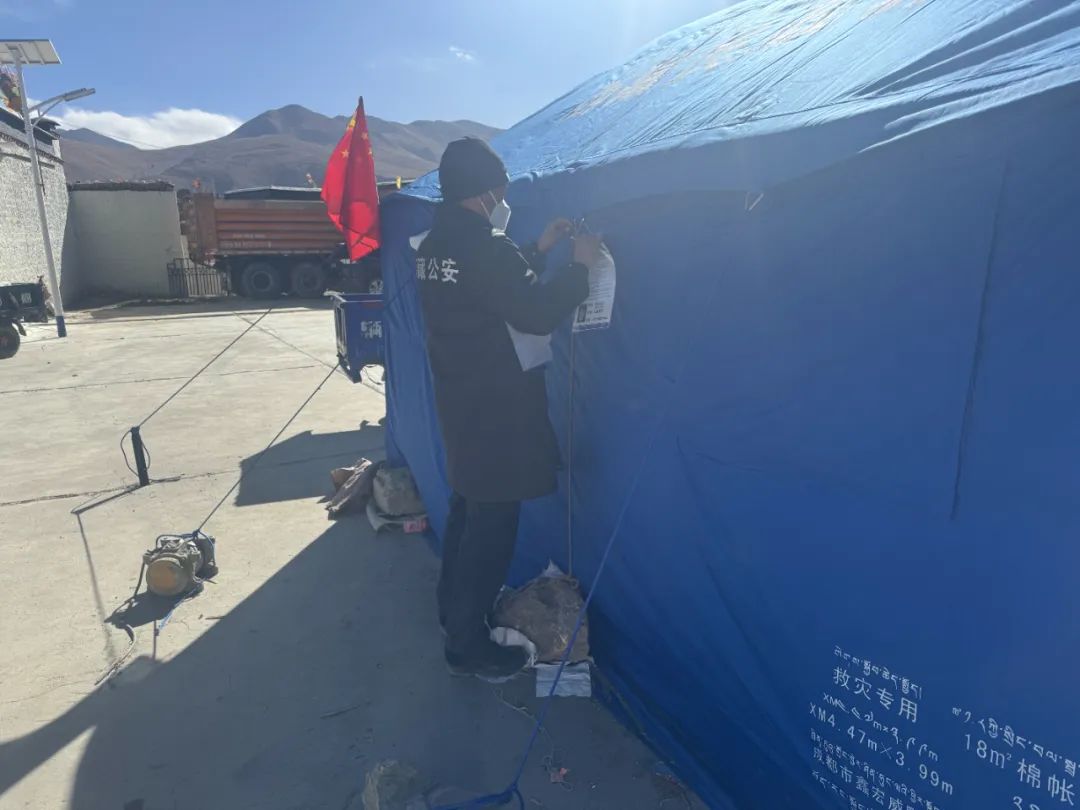 災(zāi)情如令,責(zé)任重于泰山。在這場(chǎng)爭(zhēng)分奪秒與時(shí)間賽跑的抗震救災(zāi)戰(zhàn)斗中,拉孜公安始終堅(jiān)定地與群眾并肩同行,以“伴隨式”守護(hù)的帳篷警務(wù)室,為受災(zāi)群眾筑牢安全防線。一頂頂 “帳篷警務(wù)室” 以迅雷不及掩耳之勢(shì)搭建完成,恰似一座座堅(jiān)固的堡壘;一面面鮮艷的黨旗在廢墟之上獵獵作響,傲然飄揚(yáng),它們共同構(gòu)成了守護(hù)受災(zāi)群眾生命財(cái)產(chǎn)安全的鋼鐵長(zhǎng)城,成為抗震救災(zāi)戰(zhàn)場(chǎng)上一道令人動(dòng)容的亮麗風(fēng)景線 。