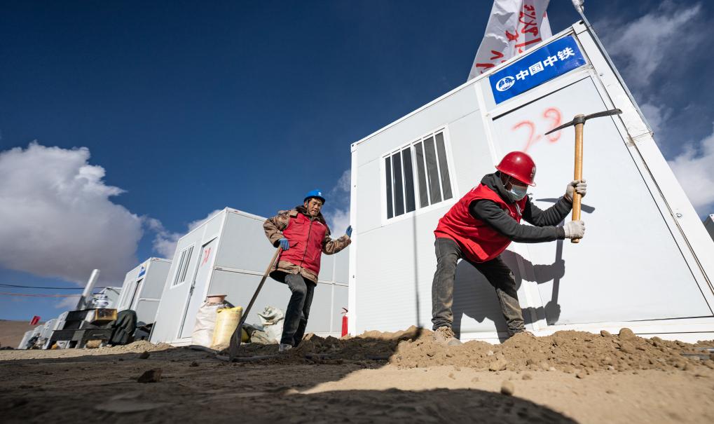 在定日縣長所鄉(xiāng)嘎旦村,國家電網(wǎng)工作人員在挖槽預埋電線(1月13日攝)。新華社記者 丁增尼達 攝