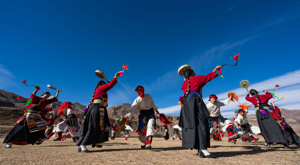 這一傳承了千年的藏族傳統(tǒng)舞蹈是一種鼓舞,也是一種融說(shuō)、唱、舞、雜技為一體的綜合性表演藝術(shù)。與悠揚(yáng)舒緩的鍋莊舞不同,熱巴舞的騰躍、旋轉(zhuǎn)動(dòng)作極具視覺(jué)沖擊力,鼓鈸的鏗鏘聲中盡顯高原兒女的豪情壯志。每逢藏歷新年或豐收慶典,熱巴舞都是最隆重的文化盛宴,深受當(dāng)?shù)厝罕娤矏?ài)。