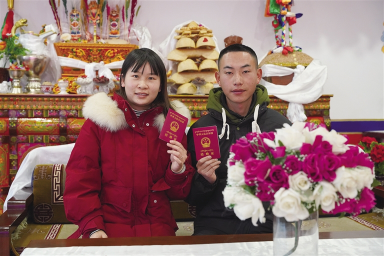 “我們在一起3年了,是表姐牽的紅線。”旦增嘎瓦臉上洋溢著幸福的笑容,緩緩說道,“初次見到卓嘎,我就對她心生好感。相處一段時(shí)間后,我發(fā)現(xiàn)她性格溫柔,和我特別合拍,于是鼓起勇氣向她表白?!彼_心地展示著剛剛領(lǐng)到的結(jié)婚證,“情人節(jié)是個(gè)好日子,我們早就計(jì)劃好今天領(lǐng)證,現(xiàn)在終于如愿以償。以后情人節(jié)和結(jié)婚紀(jì)念日合二為一,既能少買一份禮物,也不用擔(dān)心忘記啦。”