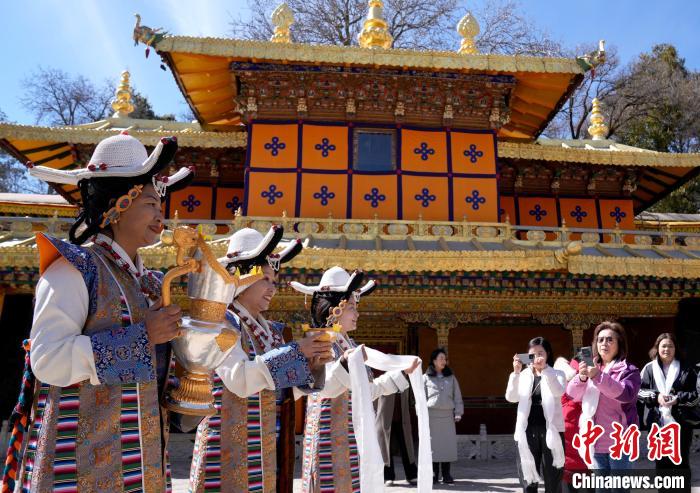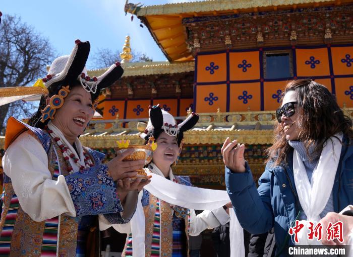 2月20日,由西藏自治區(qū)文化和旅游廳舉辦的2025年香港至拉薩航班首航旅行團(tuán)歡迎儀式在羅布林卡舉行。來自香港的游客將前往布達(dá)拉宮、大昭寺等地,開啟冬游西藏旅途。2月19日,拉薩至香港的首條地區(qū)航線正式開通。航線的開通,更加便捷了兩地居民的出行,也將進(jìn)一步促進(jìn)兩地在旅游、文化、經(jīng)貿(mào)等領(lǐng)域的交流與合作。圖為歡迎儀式現(xiàn)場,工作人員向香港游客敬獻(xiàn)青稞酒。中新社記者 李林 攝