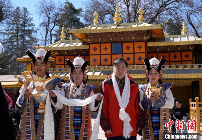 圖為歡迎儀式現(xiàn)場,香港游客在羅布林卡與身著拉薩傳統(tǒng)服飾的工作人員合影留念。中新社記者 李林 攝
