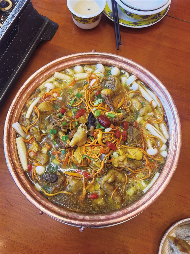 傳統(tǒng)的藏式牦牛肉火鍋講究原汁原味,湯底通常選用牦牛骨熬制數(shù)小時(shí),加入少許鹽和香料即可。鍋底先鋪上一層時(shí)蔬和粉絲,再鋪一層牦牛肉排,最上面是土豆、蘿卜、白菜、青筍、木耳等耐煮的蔬菜,再加上肥瘦相間的新鮮牦牛肉慢慢燉煮。各類食材的香味相互碰撞,別提多香了!為了不掩蓋食物本身的香氣,藏式牦牛肉火鍋的蘸料通常比較簡單,可以用辣椒醬、蔥花、香菜等調(diào)制,也可以根據(jù)個(gè)人喜好加入芝麻醬、腐乳等。牦牛肉火鍋味道濃郁,建議搭配清淡的酥油茶或甜茶等飲品。