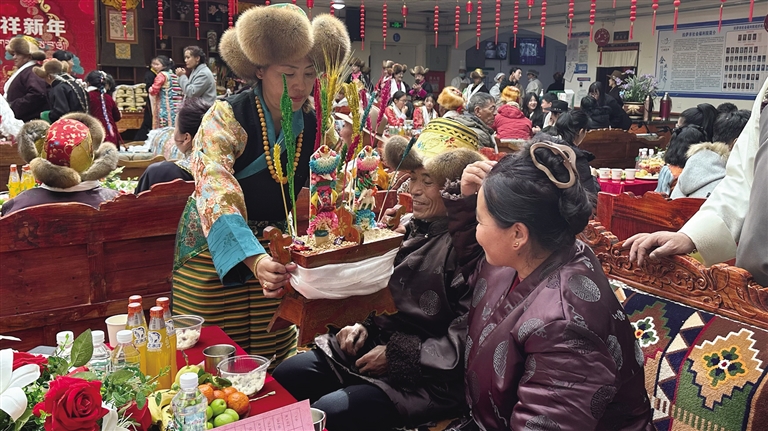 拉薩市社會福利院工作人員白央告訴記者,藏歷新年前一周,她們就為老人們洗澡、修剪指甲,對福利院進(jìn)行全面大掃除。為營造節(jié)日氛圍,還提前為老人裝扮居住環(huán)境,掛上紅燈籠,擺上切瑪盒等。“這是我在福利院工作的第二年。藏歷新年雖不能陪伴在父母身邊,但與老人們一同過年,讓我深感幸福且意義重大。”
