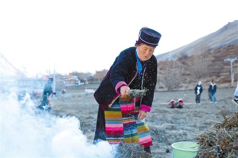 林芝市工布江達(dá)縣工布江達(dá)鎮(zhèn)阿沛村村民手捏糌粑撒向點燃的青岡樹堆,祈求風(fēng)調(diào)雨順。記者 謝筱純 攝