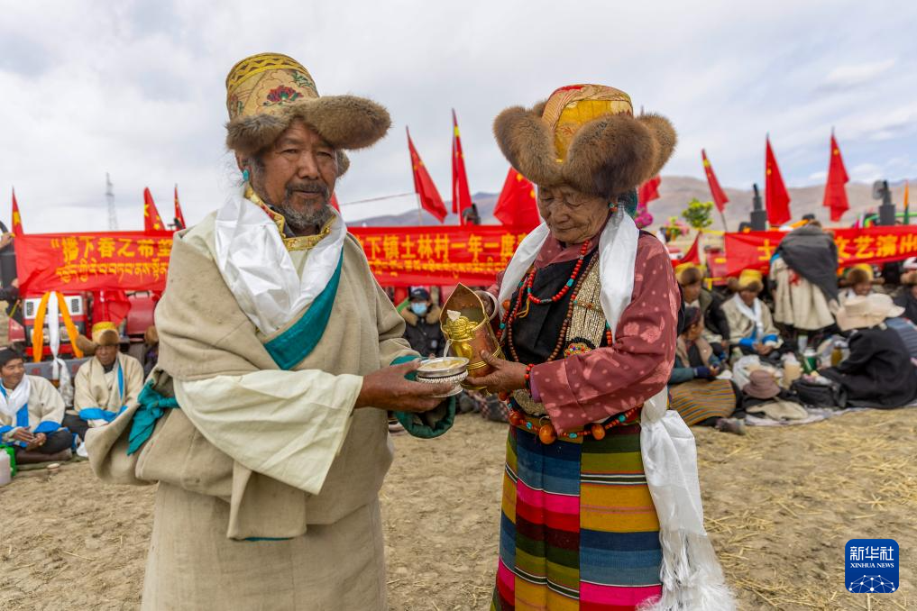 作為村中長(zhǎng)者,尼瑪(左)在春耕儀式上接受敬酒(3月16日攝)。新華社記者 姜帆 攝