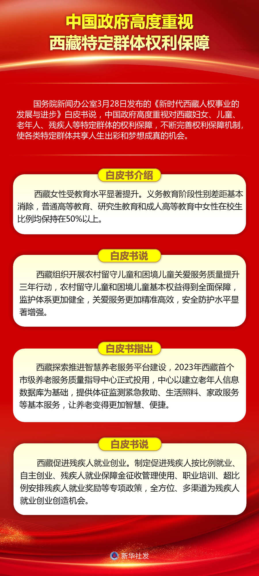 國務(wù)院新聞辦公室28日發(fā)布的《新時(shí)代西藏人權(quán)事業(yè)的發(fā)展與進(jìn)步》白皮書說,中國政府高度重視對西藏婦女、兒童、老年人、殘疾人等特定群體的權(quán)利保障,不斷完善權(quán)利保障機(jī)制,使各類特定群體共享人生出彩和夢想成真的機(jī)會。