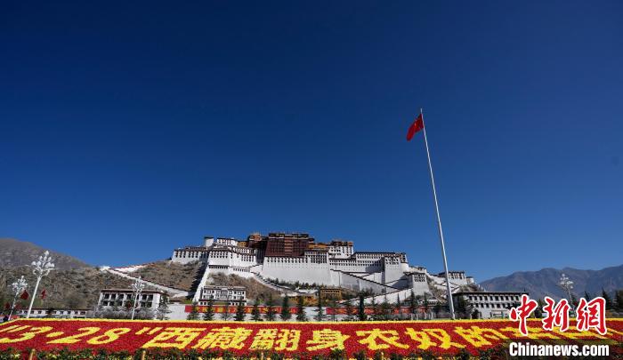 圖為3月28日,西藏布達(dá)拉宮廣場擺放西藏百萬農(nóng)奴解放紀(jì)念日標(biāo)語。李林 攝