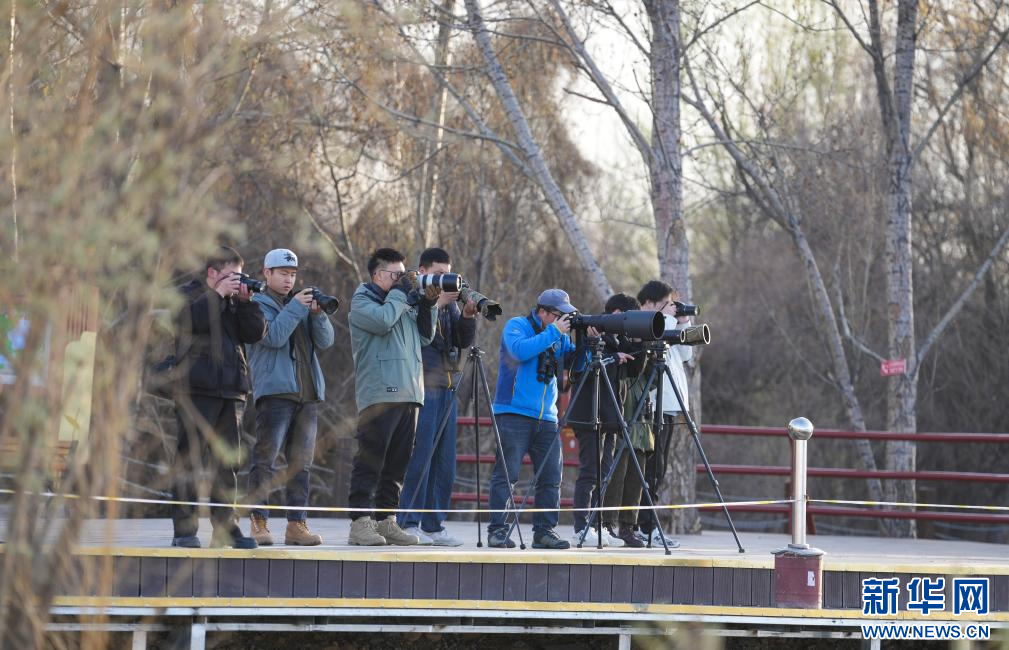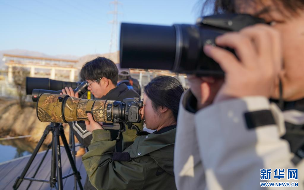 3月29日,參加采風(fēng)活動(dòng)的成員在拉魯濕地觀鳥拍照。新華社記者 晉美多吉 攝